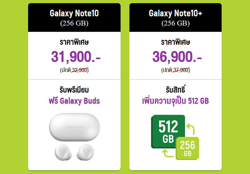 พิเศษจองเครื่องไม่ติดสัญญาผ่านช่องทาง Samsung Experience Store สามารถเลือกเพิ่มความจุเป็น 512GB เมื่อจอง Galaxy Note 10+ รุ่นความจุ 256GB หรือเลือกรับหูฟังไร้สาย Galaxy Buds มูลค่า 4,990 บาทฟรี และรับฟรี Galaxy Buds เมื่อจอง Galaxy Note 10 (*โปรโมชั่นนี้ไม่ร่วมกับผู้ให้บริการเครือข่าย, Samsung Online Store และ Lazada)