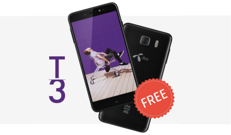 รับฟรี dtac phone T3 มูลค่า 3,990 บาท เมื่อชำระค่าบริการล่วงหน้า 1,200 บาท ที่ศูนย์บริการดีแทคทุกสาขา โดยมาพร้อมหน้าจอ IPS ขนาด 5.3 นิ้ว ความละเอียด HD รัน Android 7.0 Nougat ชิปเซ็ต Quad Core ความเร็ว 1.25 GHz หน่วยความจำ RAM 2GB ความจุ 16GB รองรับ microSD สูงสุด 32GB