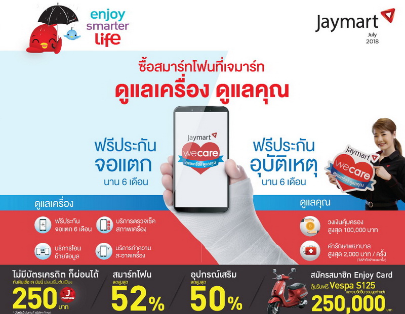 สวัสดีเพื่อนๆ ผู้ติดตามทุกท่านค่ะ วันนี้เรามีโปรโมชั่นมือถือสุดคุ้มจาก Jaymart ประจำเดือนกรกฎาคม 2561 มาฝากให้ได้ชมกัน พิเศษสุดๆ สำหรับเพื่อนๆ ที่ซื้อสมาร์ทโฟนที่ Jaymart ฟรีประกันจอแตก และฟรีประกันอุบัติเหตุนาน 6 เดือน กับ Jaymart We Care ดูแลเครื่อง ดูแลคุณ