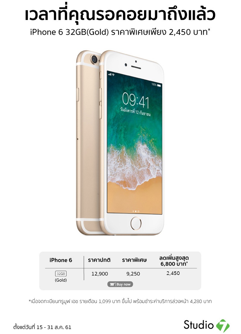สวัสดีเพื่อนๆ ผู้ติดตามทุกท่านค่ะ วันนี้เรามีโปรโมชั่นดีๆ มาฝากกันอีกเช่นเคย สำหรับครั้งนี้เป็นโปรโมชั่น iPhone 6 ความจุ 32GB ตัวเครื่องสีทองจาก Studio 7 และ BaNANA โดยให้เพื่อนๆ เป็นเจ้าของได้ในราคาเครื่องเปล่าไม่ติดสัญญาเพียง 9,250 บาท จากราคาปกติ 12,900 บาท หรือซื้อได้ในราคาถูกสุดเพียง 2,450 บาท* เมื่อซื้อเครื่องพร้อมแพ็กเกจที่กำหนด เราไปชมรายละเอียดกันเลยค่ะ