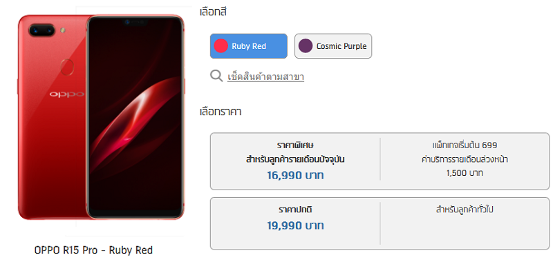 ทั้งนี้ OPPO R15 Pro สนนราคา 19,990 บาท ซึ่งเพื่อนๆ สามารถเป็นเจ้าของได้ในราคาถูกสุดเพียง 15,490 บาท พูดแล้วอย่ารอช้าเราไปชมรายละเอียดโปรโมชั่นจากผู้ให้บริการเครือข่าย AIS, TrueMove H และ dtac กันเลยค่ะ