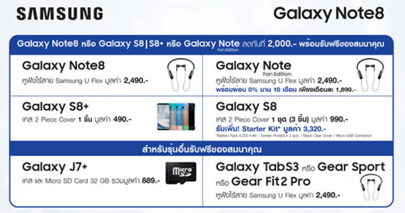 Samsung จัดโปรคุ้ม! Galaxy Note8 ลดค่าเครื่องทันที 2,000 บาท รับฟรี! หูฟังไร้สาย U Flex มูลค่า 2,490 บาท