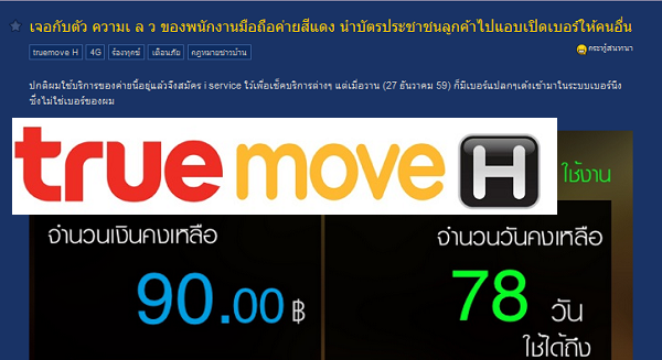 งามหน้า!! พนักงานทรูถือวิสาสะนำบัตรประชาชนลูกค้าที่ลืมไว้ ไปเปิดเบอร์ให้คนอื่นหน้าตาเฉย สวัสดีค่ะเพื่อนๆ เรียกได้ว่าเป็นประเด็นดราม่าส่งท้ายปี 2559 กันเลยก็ว่าได้ สำหรับกรณีของคุณ MixerMix จาก Pantip.com ที่ได้ตั้งกระทู้บทความที่มีชื่อว่า “เจอกับตัว ความเลวของพนักงานมือถือค่ายสีแดง นำบัตรประชาชนลูกค้าไปแอบเปิดเบอร์ให้คนอื่น” ซึ่งกำลังได้รับความสนใจจากเพื่อนๆ สมาชิกในเว็บไซต์เป็นอย่างมาก พร้อมกับมีการติดตามว่าทางค่ายจะจัดการอย่างไรกับพนักงานที่ก่อเรื่อง กรณีนี้เกิดขึ้นเมื่อเจ้าของกระทู้ท่านดังกล่าวได้สมัคร iService เพื่อเอาไว้เช็คบริการต่างๆ ของทางค่าย แต่เมื่อวันที่ 27 ธ.ค. 59 ที่ผ่านมาพบว่ามีเบอร์แปลกที่ไม่ใช่ของตนเองเด้งเข้ามาอยู่ในระบบ เจ้าของกระทู้จึงปักใจเชื่อทันทีว่าตนเองนั้นน่าจะถูกนำบัตรประชาชนไปใช้เปิดเบอร์ใหม่แน่นอน จึงได้แกล้งโทรไปยังเบอร์แปลกดังกล่าว พร้อมกับไปแจ้งความลงบันทึกประจำวันไว้เพื่อเป็นหลักฐาน