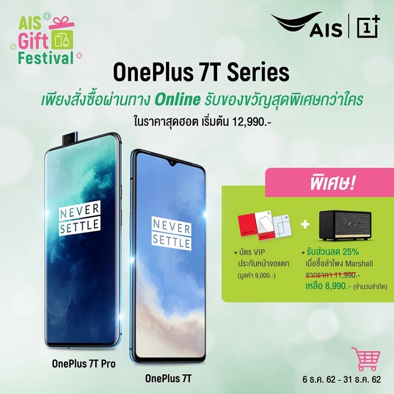 และด้วยการตอบรับที่ดีเยี่ยมของ OnePlus 7T Series สำหรับการเริ่มวางจำหน่ายในระยะเวลา 1 เดือนที่ผ่านมา พร้อมกับช่วงเวลาเทศกาลแห่งความสุขตลอดเดือนธันวาคมนี้ ทาง AIS จึงร่วมจับมือ OnePlus ส่งมอบแคมเปญโปรโมชัน AIS Gift Festival x OnePlus 7T Series โปรพิเศษส่งท้ายปี! รับข้อเสนอที่เหนือกว่าใคร เมื่อสั่งจอง OnePlus 7T Series รุ่นใดก็ได้ พร้อมมัดจำค่าเครื่อง 2,000 บาท ในราคาสุดฮอตเริ่มเพียง 12,990 บาท ผ่านทาง AIS Online