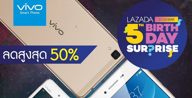 vivo ร่วมฉลองแคมเปญใหญ่กับ Lazada จัดโปรพิเศษลดราคาสูงสุด 50% พร้อมของแถม 10 รายการ vivo Smartphone นอกจากจะมีจำหน่ายให้เห็นตามหน้าร้านทั่วไปแล้ว นอกจากนี้ vivo Smartphone ยังมีจำหน่ายทางช่องทางออนไลน์อีกด้วย และตอนนี้ทาง vivo ได้จับมือร่วมแคมเปญใหญ่กับ Lazada “Birthday Surprise Campaign” ซึ่งเป็นแคมเปญฉลอง Lazada ครบรอบ 5 ปี vivo Thailand ได้ทำการขนกองทัพทั้งรุ่นน้องใหม่