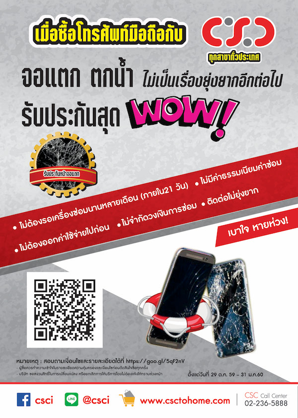 CSC Mobile Care รับประกันสุด Wow!! หน้าจอแตก หรือทำตกน้ำ ก็ไร้กังวล จอแตก ตกน้ำ ไม่เป็นเรื่องยุ่งยากอีกต่อไป ด้วยรับประกันสุด Wow จาก CSC Mobile Care เป็นการบริการพิเศษสำหรับลูกค้าของ บริษัท คอมพิวเตอร์ ซิสเท็ม คอนเน็คชั่น อินเตอร์แนชชั่นแนล จำกัด หรือ ซีเอสซี (CSC) มอบสิทธิประโยชน์ให้กับลูกค้าที่ซื้อโทรศัพท์มือถือยี่ห้อและรุ่นที่ร่วมรายการ โดยการบริการพิเศษนี้เป็นแผนประกันคุ้มครองโทรศัพท์มือถือจากอุบัติเหตุ เครื่องตกหน้าจอแตก