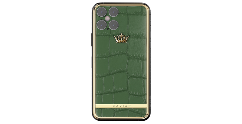 – Caviar iPhone 12 Pro Green Alligator วัสดุที่ใช้เป็นหนังจระเข้สีเขียวตกแต่งด้วยขอบทองคำ ราคา 5,060 ดอลลาร์สหรัฐฯ หรือประมาณ 158,000 บาท