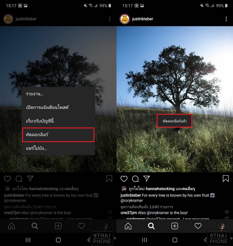 แล้วเลือกคำว่า “คัดลอกลิงก์” ซึ่งหลังจากที่เรากดไปแล้ว มันจะขึ้นคำว่าคัดลอกลิงก์แล้ว และหากเพื่อน ๆ เลือกคำว่า “แชร์ไปยัง…” มันจะแชร์เป็นลิงก์นะคะ ไม่ใช่รูปภาพ