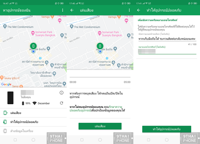 1. เล่นเสียง ในส่วนนี้เมื่อเรากดไปที่แถบเมนูดังกล่าว เครื่องสมาร์ทโฟนที่หายหรือหาไม่เจอจะส่งเสียงดังในระดับดังที่สุดต่อเนื่องนานถึง 5 นาที แม้ว่าเครื่องสมาร์ทโฟนจะเปิดเป็นโหมดเงียบเสียงไว้ก็ตาม ซึ่งเมนูนี้จะทำให้เราหามือถือที่ลืมไว้เจอง่ายๆ จากเสียงที่ดังขึ้นมา