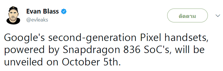เมื่อหลายวันก่อน Evan Blass เจ้าของบัญชีทวิตเตอร์แหล่งข่าวลือพร้อมภาพหลุดชื่อดังได้เผยข้อมูลการเปิดตัวของ Google Pixel 2 ออกมาให้เราได้ทราบกัน จากข้อมูลระบุว่าสมาร์ทโฟนรุ่นดังกล่าวมีกำหนดการเปิดตัว 5 ตุลาคม 2017 และจะมาพร้อมขุมพลัง Snapdragon 836 และหากข้อมูลดังกล่าวเป็นจริง จะนับได้ว่า Google Pixel 2 เป็นสมาร์ทโฟนรุ่นแรกที่ใช้ชิปเซ็ตรุ่นดังกล่าว