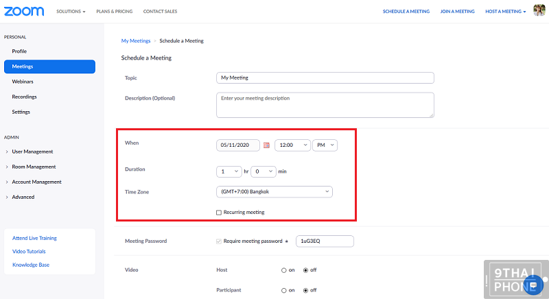 เมื่อคลิกเข้าไปที่หน้า Schedule a New Meeting จะมีแถบให้กรอกข้อมูลต่าง ๆ อาทิ หัวข้อการประชุม, คำอธิบายเกี่ยวกับการประชุม, การตั้งค่าวิดีโอ, การตั้งวันที่/เวลา และระยะเวลาในการประชุม เป็นต้น