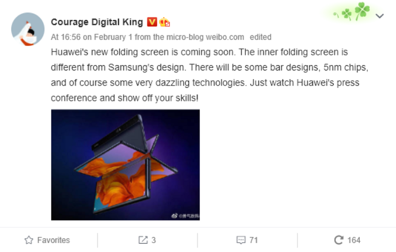 โดยทาง Courage Digital King แหล่งข่าวบนเว็บไซต์ Weibo บอกใบ้ว่า Huawei Mate X2 จะถูกเปิดตัวออกมาอย่างเป็นทางการช่วงก่อนสิ้นเดือนกุมภาพันธ์ และ Huawei Mate X2 ได้รับการกล่าวถึงว่าจะใช้ดีไซน์จอพับที่แตกต่างจากของ Samsung รวมถึงจะใช้ชิปเซ็ต 5 นาโนเมตร ที่เชื่อว่าเป็น Kirin 9000 Series และจะมาพร้อมเทคโนโลยีใหม่ ๆ ที่น่าตื่นตาตื่นใจ