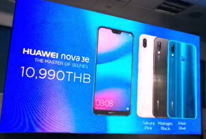 ล่าสุด Huawei ประเทศไทย ได้ทำการเปิดตัว Huawei nova 3e (หรือ Huawei P20 Lite) อย่างเป็นทางการแล้วในประเทศไทย เคาะราคาวางจำหน่ายอยู่ที่ 10,990 บาท (RAM 4GB + ROM 128GB) ตัวเครื่องมีให้เลือก 3 สี ได้แก่ สีชมพู (Sakura Pink), สีดำ (Midnight Black) และสีน้ำเงิน (Klein Blue)