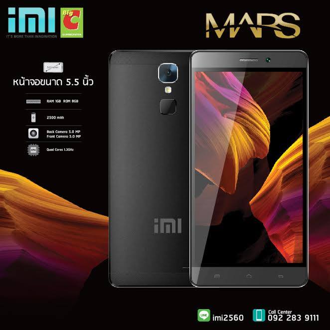 ล่าสุด iMI แบรนด์ผู้ผลิตสมาร์ทโฟนจากฮ่องกง ได้ทำการเปิดตัว iMI Mars สมาร์ทโฟนหน้าจอ TFT ขนาดใหญ่ 5.5 นิ้ว ความละเอียด HD ดีไซน์ทันสมัยที่มาพร้อมกล้องหน้า-หลังความละเอียด 5 ล้านพิกเซล พ่วง LED flash รองรับการใช้งาน 2 ซิมการ์ด, Wi-Fi b/g/n, Bluetooth 4.0, micro USB 2.1 มีหน่วยความจำ RAM ขนาด 1GB ความจุภายในตัวเครื่อง 8GB ทำงานอยู่บนระบบปฏิบัติการ Android ครอบทับ iMI UI 6.0