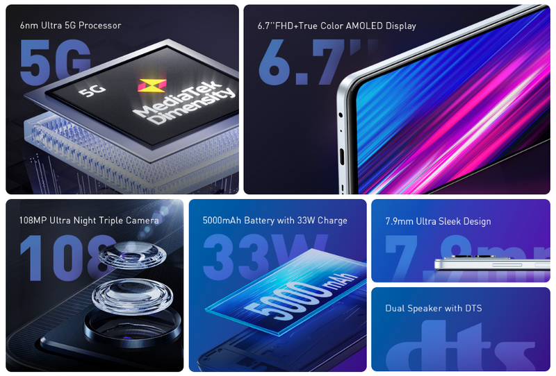 • โปรเซสเซอร์ 5G สถาปัตยกรรมขนาด 6nm เทคโนโลยีทรานซิสเตอร์ขั้นสูง ทำให้สิ้นเปลืองพลังงานน้อยลงและให้ประสิทธิภาพการทำงานที่ทรงพลังยิ่งขึ้น
