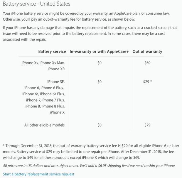 – iPhone SE, iPhone 6, iPhone 6 Plus, iPhone 6s, iPhone 6s Plus, iPhone 7, iPhone 7 Plus, iPhone 8, iPhone 8 Plus และ iPhone X ราคาเปลี่ยนแบตเตอรี่ $49 หรือประมาณ 1,600 บาท (ส่วนราคา $29 หรือประมาณ 950 บาท จะสิ้นสุดในปี 2018)