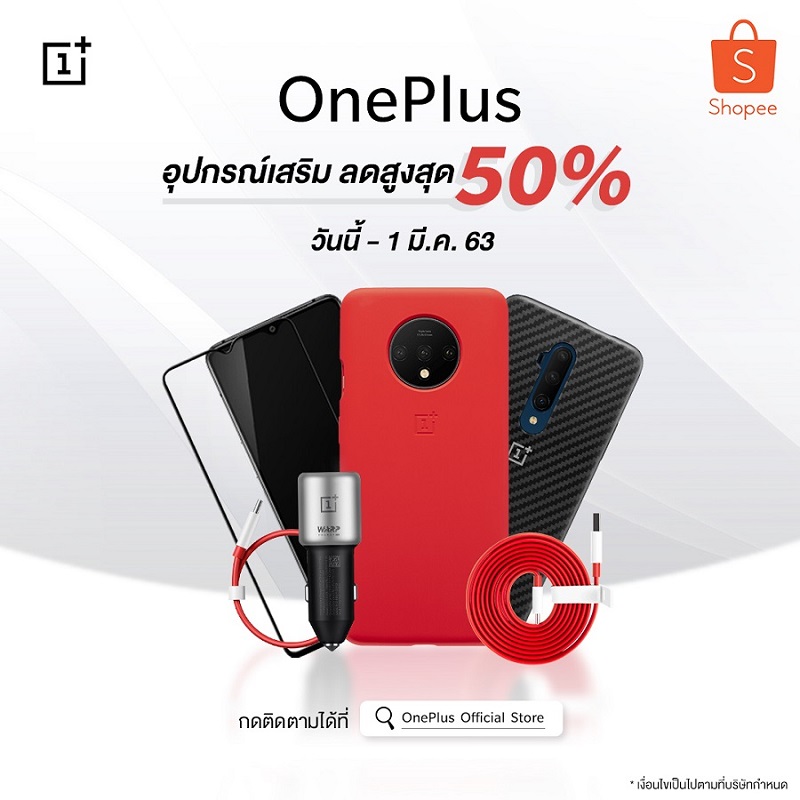 เท่านั้นยังไม่พอยังพบกับส่วนลดอุปกรณ์เสริมแท้ของ OnePlus Official ลดสูงสุด 50%  อาทิเช่น OnePlus 7 Pro Protective Case, OnePlus 6 Silicone Protective Case Red หรือ OnePlus 7T 3D Tempered Glass Screen Protector ผ่านช่องทาง Shopee : OnePlus Official Store ตั้งแต่ 24 กุมภาพันธ์ – 1 มีนาคม 2563 นี้เท่านั้น