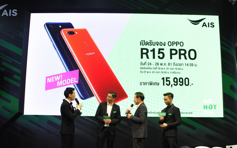 บริษัท แอดวานซ์ อินโฟร์ เซอร์วิส จำกัด (มหาชน) หรือ เอไอเอส จับมือ บริษัท ไทย ออปโป้ จำกัด ส่ง OPPO R15 Pro ลงตลาดประเทศไทย ผลักดันสมาร์ทโฟนรุ่นใหม่จากซีรีย์ R คือ OPPO R15 Pro โปรดักซ์ตัวใหม่ที่มาพร้อมกับกล้องคู่ (Dual Camera)20+16 MP พร้อม AI Portrait Mode และกลับมาอีกครั้งกับ VOOC Flash Charge ชาร์จเพียง 5 นาที โทรได้นาน2ชั่วโมง