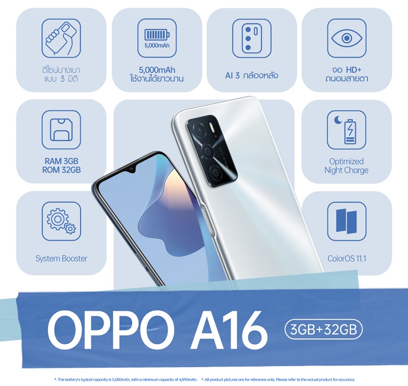 OPPO A16 รุ่น RAM 3GB + ROM 32GB สมาร์ตโฟนสุดคุ้ม พร้อมมอบความบันเทิงเต็มอิ่มยาวนานตลอดวันได้ง่ายยิ่งขึ้น มาพร้อมราคาใหม่เพียง 4,699 บาท จากราคาปกติ 4,999 บาท ตั้งแต่วันที่ 17 กันยายน 2565 เป็นต้นไป