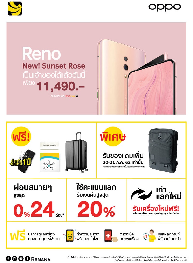 เป็นเจ้าของ OPPO Reno Series สีใหม่ Sunset Rose ได้ง่ายๆ ในราคาถูกที่สุดเพียง 11,490 บาท* จากปกติ 16,990 บาท เมื่อเปิดเบอร์ TrueMove H พร้อมสมัครแพ็คเกจ 1,099 บาทขึ้นไป และจ่ายค่าบริการล่วงหน้า 3,210 บาท สัญญา 12 เดือน *เฉพาะบานาน่าสาขาที่ร่วมรายการเท่านั้น / ของแถมมีจำนวนจำกัด