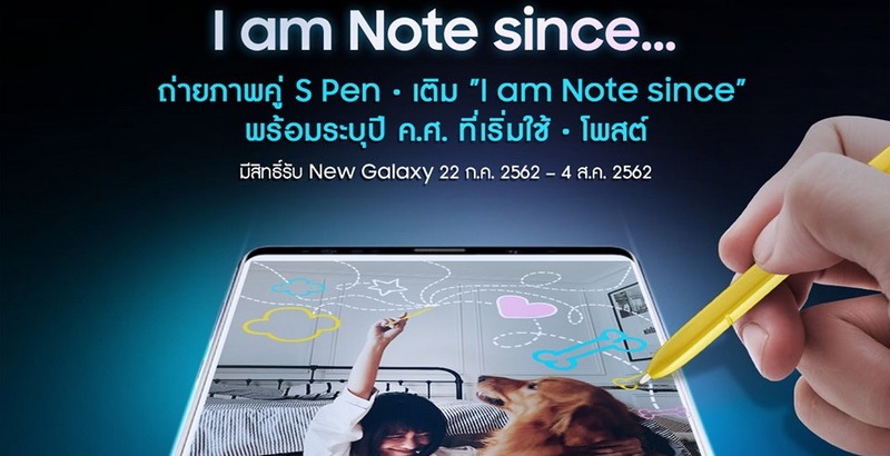 Samsung ชวนสาวกโน้ตมาโชว์พาว! ร่วมแสดงพลังแฟนพันธ์แท้ ผ่านแคมเปญ “I am Note since…” ร่วมกิจกรรมได้ตั้งแต่วันที่ 22 กรกฎาคม – 4 สิงหาคม 2562 มีสิทธิ์รับ New Galaxy เป็นระยะเวลาเกือบ 10 ปีที่ Galaxy Note สร้างปรากฎการณ์ครองใจผู้บริโภค ไม่ว่าจะเป็นประสิทธิภาพที่เหนือกว่าเดิมในทุกครั้งที่เปิดตัว ดีไซน์ที่โดดเด่นเป็นเอกลักษณ์ รวมถึง S Pen ปากกาอัจฉริยะที่ครองใจผู้บริโภคมาอย่างยาวนาน