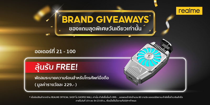 • สำหรับออเดอร์ที่ 21 – 100 เมื่อสั่งซื้อขั้นต่ำ 899 บาท ลุ้นรับฟรี พัดลมระบายความร้อนสำหรับโทรศัพท์มือถือ มูลค่า 229 บาท