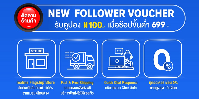 เมื่อกดติดตามร้านค้า realme Official Store เฉพาะ 5 พฤษภาคมนี้ รับโค้ดลดเพิ่ม 100 บาท