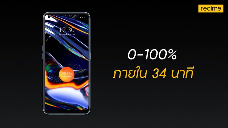 realme 7 Pro มาพร้อมกับเทคโนโลยีการชาร์จเร็ว 65W SuperDart Charge นวัตกรรมการชาร์จเร็วที่เหนือขั้น เต็มเปี่ยมไปด้วยประสิทธิภาพการชาร์จ สามารถชาร์จแบตเตอรี่เต็ม 100% ภายในระยะเวลาเพียง 34 นาที