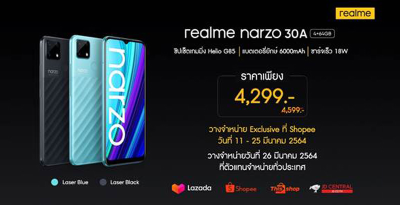 โดยวางจำหน่าย Exclusive ผ่านช่องทาง Shopee ในวันที่ 11 ถึง 25 มีนาคมนี้เท่านั้น และสามารถเป็นเจ้าของได้พร้อมกันในวันที่ 26 มีนาคม 2564 ที่ realme Brand Shop และตัวแทนจำหน่ายทั่วประเทศ
