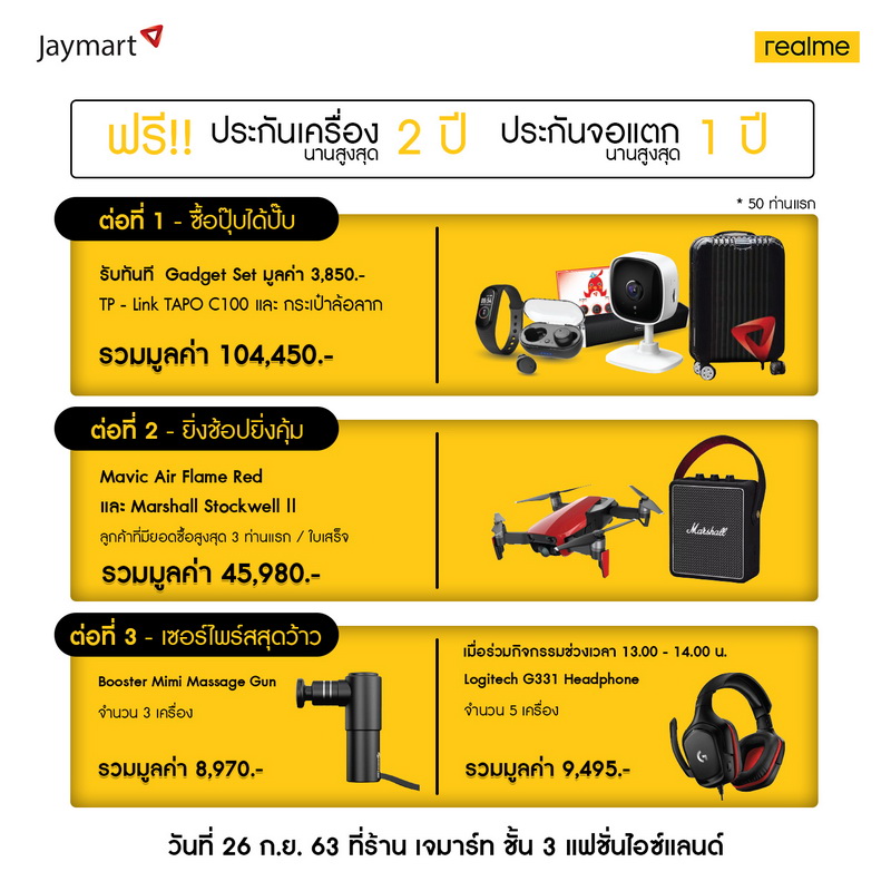 สำหรับลูกค้าที่จอง realme 7 Pro ที่ Jaymart ทุกสาขา ระหว่างวันที่ 17-24 กันยายนนี้ เพียงนำใบเสร็จการซื้อเครื่องมาแสดงรับบัตรคิวที่ Jaymart สาขา Fashion Island ฟรี! ประกันเครื่องนานสูงสุด 2 ปีพร้อมประกันจอแตก นานสูงสุด 1 ปี นอกจากนี้ รับ 3 รางวัลถึง 3 ต่อ