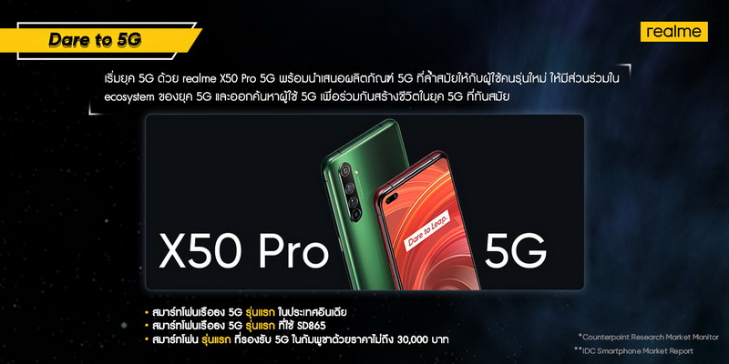 realme มุ่งมั่นที่จะมอบผลิตภัณฑ์ 5G โดยได้เริ่มต้นจากการเปิดตัว realme X50 Pro 5G ซึ่ง realme ได้เปิดตัวสมาร์ตโฟนเรือธง 5G รุ่นแรกอย่างเป็นทางการแล้วที่ประเทศอินเดีย ไทย และกัมพูชา