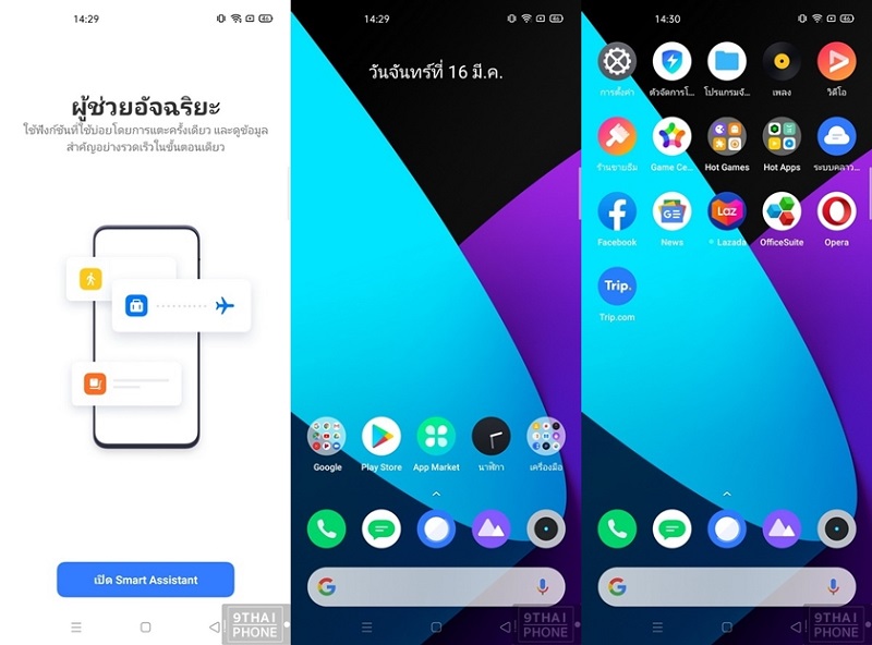 หลังจากที่เราปลดล็อกหน้าจอแล้ว ก็จะพาเข้าสู่หน้า Home Screen โดยมีมาให้จำนวน 3 หน้า สามารถเพิ่มหน้าใช้งานได้ภายหลัง แอปฯ ที่ติดตั้งมากับตัวเครื่องถูกจัดวางเป็นระเบียบไม่รก UI แบบใหม่จาก realme ภายใต้ระบบปฏิบัติการ Android 10 สีสันสดใสขึ้น สามารถปรับแต่งไอคอนได้เอง และหากปัดหน้าจอซ้ายสุดไปทางขวาจะพบกับหน้าผู้ช่วยอัจฉริยะ หรือการเปิดใช้งาน Smart Assistant แบบทันที