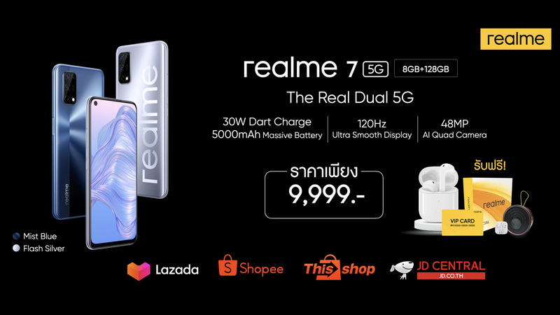 realme 7 5G ราคาจำหน่ายเพียง 9,999 บาท มีให้เลือก 2 สี ได้แก่ Mist Blue และ Flash Silver เรียกได้ว่าเป็นสมาร์ตโฟน Dual 5G รุ่นแรก ในระดับราคาเดียวกัน ที่มาพร้อมราคาจับต้องได้เข้าถึงง่าย และมีราคาที่เหมาะสมมากที่สุดในตอนนี้เลยก็ว่าได้