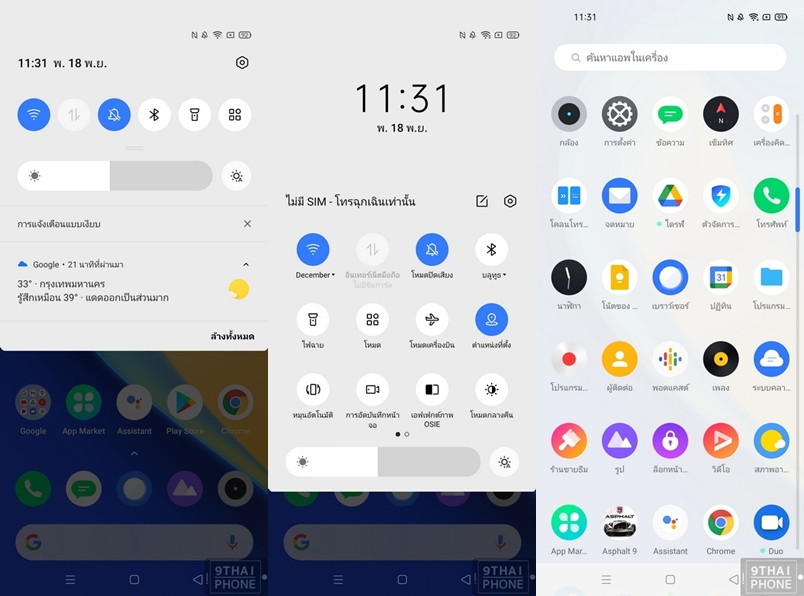 เมื่อเลื่อนหน้าจอด้านบนลงจะพาเข้าสู่หน้า Quick Settings มีเมนูแถบแจ้งเตือน และสามารถเข้าถึงการใช้งานต่าง ๆ ได้อย่างรวดเร็ว และหากปัดหน้าจอขึ้นด้านบนจะพบกับหน้ารวมเมนูการใช้งานทั้งหมดในเครื่อง