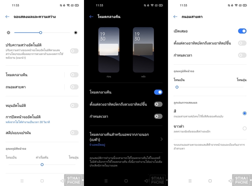 หน้าจอของ realme 7 5G รองรับฟังก์ชันการปรับใช้งานหน้าจอต่าง ๆ ไม่ว่าจะเป็น การปรับความสว่างอัตโนมัติ, การเปิดโหมดถนอมสายตา ลดการแผ่รังสีของหน้าจอเพื่อป้องกันการปวดตา, ปรับตั้งค่าตัวกรองแสงสีฟ้า เปลี่ยนหน้าจอให้เป็นสีเหลืองนวลสบายตา, โหมดกลางคืนเปลี่ยนไปใช้งานหน้าจอโทนสีมืด เป็นต้น