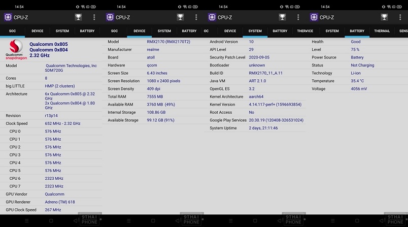 ส่วนข้อมูลตามแอปฯ CPU-Z ระบุว่าหน่วยความจำแรมที่ใช้งานได้ทั้งหมดเหลือ 3760MB และความจุที่ใช้งานได้ทั้งหมดเหลือ 99.12GB ใช้ชิปแบบ 8 คอร์ หน้าจอ Full HD+ ความเร็ว GPU อยู่ที่ 267 MHz เป็นต้น