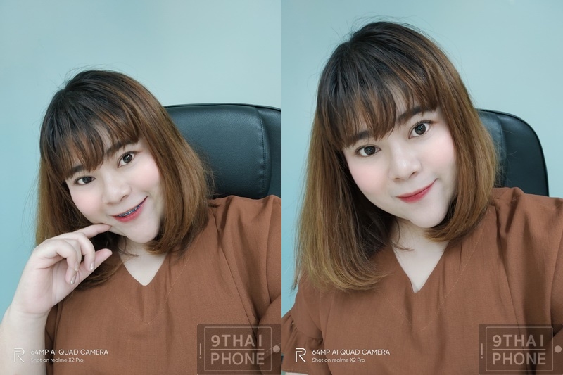 สำหรับกล้องหน้าของ realme X2 Pro มาพร้อมกล้อง AI ความละเอียด 16MP ค่ารูรับแสงกว้าง f/2.0 พร้อมฟีเจอร์ AI Beauty ปรับค่าผิวสวยเนียนแบบละเอียดได้ตามไลฟ์สไตล์ โดยมีให้เลือกปรับทั้ง ใบหน้าสวยเนียน, ใบหน้าเรียว, ใบหน้าเล็ก, ปรับรูปคาง, ปรับดวงตาให้กลมโต, ปรับรูปทรงจมูก, เก็บรายละเอียดโดยรวม และการสร้างมิติภาพให้โดดเด่นแบบ 3D เลือกปรับได้ถึง 100 ระดับ สังเกตได้ที่จุดวงกลมเล็กๆ บนหน้าจอ หรือจะรีเซ็ตตั้งค่าให้ระบบ AI ปรับแต่งแบบอัตโนมัติเลยก็ได้ค่ะ