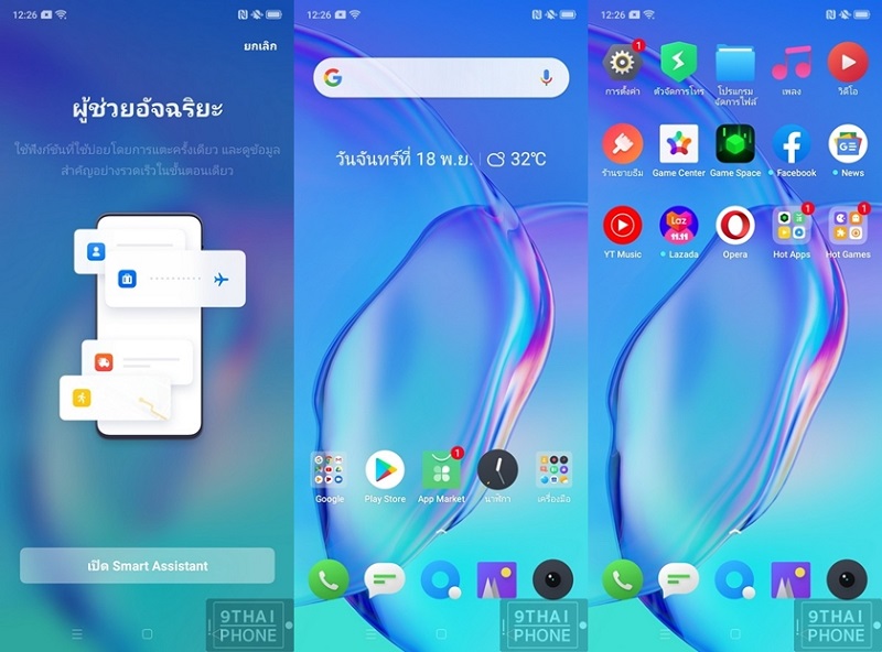 หลังจากที่เราปลดล็อกหน้าจอเรียบร้อยแล้ว จะพาเข้าสู่หน้า Home Screen โดยมีมาให้จำนวน 3 หน้า สามารถเพิ่มหน้าใช้งานได้ภายหลัง สำหรับแอปฯ ที่ติดตั้งมากับตัวเครื่องถูกจัดวางเป็นระเบียบไม่รก UI แบบใหม่จาก ColorOS 6.0 และหากปัดหน้าจอซ้ายสุดไปทางขวาจะพบกับหน้าผู้ช่วยอัจฉริยะ หรือการเปิดใช้งาน Smart Assistant แบบทันที