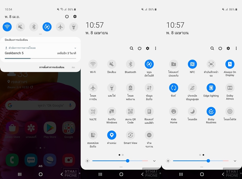 หากเลื่อนหน้าจอด้านบนลงจะพบกับหน้า Quick Settings มีแถบแจ้งเตือนต่าง ๆ และมีฟีเจอร์ให้เลือกใช้งานมากมาย อาทิ เปิดใช้งาน Wi-Fi, 4G, ไฟฉาย, Bluetooth, สแกน QR Code, ฟีเจอร์ Always On Display, บันทึกวิดีโอหน้าจอ, เปิด Dark Mode และเปิดโหมดประหยัดพลังงานขั้นสูง เป็นต้น