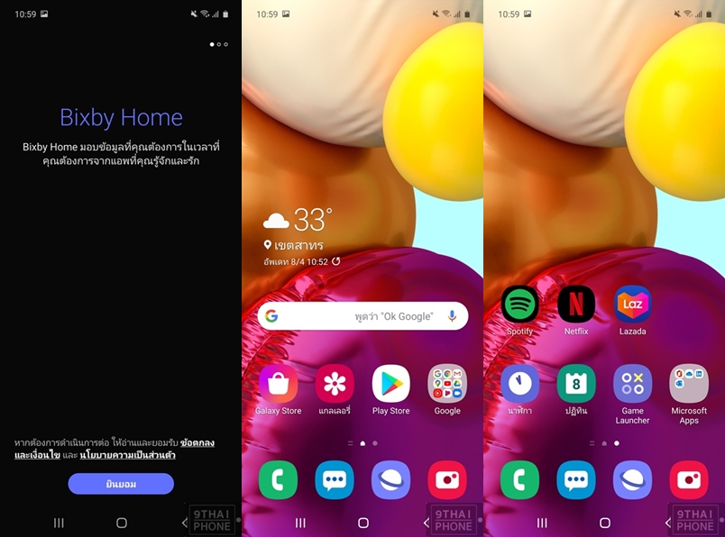 หลังจากปลดล็อคหน้าจอจะพาเข้าสู่หน้า Home Screen โดยมีมาให้ทั้งหมด 3 หน้า แอปฯ ที่ติดมากับตัวเครื่องจัดวางเป็นระเบียบไม่รกตา หากปัดจอไปทางซ้ายสุดจะเป็นหน้า Bixby Home