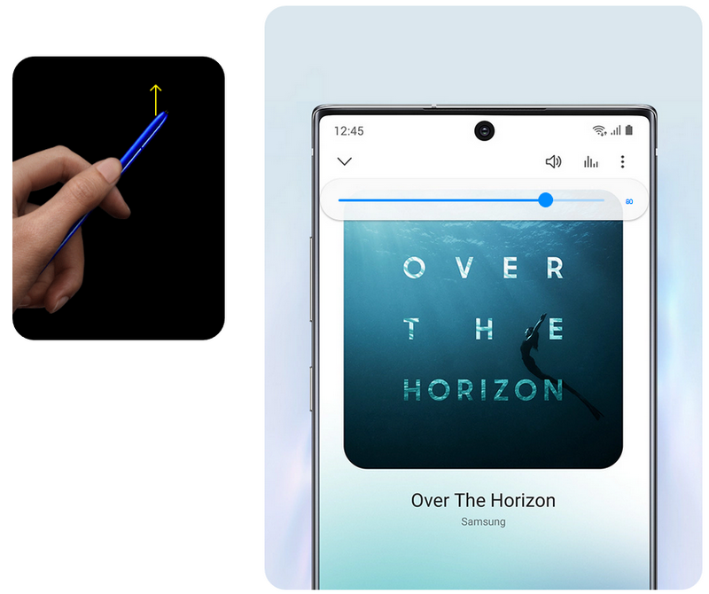 • เสียง เพิ่มเสียงเพียงเลื่อนมือตวัดปากกา S Pen ขึ้น และลดเสียงเพียงเลื่อนมือตวัดปากกา S Pen ลง โดยไม่ต้องกดปุ่มปรับเสียง