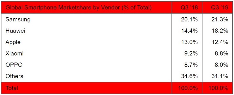 โดย Samsung มียอดจำหน่ายสมาร์ทโฟนทั่วโลกในไตรมาสที่ 3 เพิ่มขึ้น 8% ครองส่วนแบ่งการตลาดอยู่ที่ 21.3% ตามมาด้วย Huawei มียอดจำหน่ายเติบโตขึ้น 29% ครองส่วนแบ่งการตลาด 18.2% ขณะที่ในทางตรงกันข้าม Apple ยังคงลดลงอย่างต่อเนื่องที่ 3% เช่นเดียวกับ Xiaomi และ OPPO ลดลง 2% และ 6% ตามลำดับ