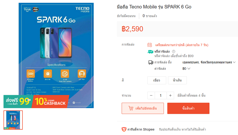 อย่างไรก็ดี TECNO Spark 6 Go มีวางจำหน่ายแล้วในไทย ราคาอยู่ที่ 2,590 บาท สำหรับรุ่น RAM 2GB + ROM 32GB ใครที่สนใจสามารถสั่งซื้อได้ผ่านช่องทางออนไลน์ อาทิ Shopee และ Lazada เป็นต้น