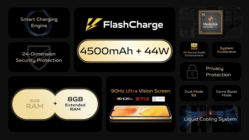 อีกทั้งยังสามารถขยายความจุได้สูงสุดถึงอีก 1TB ด้วยแบตเตอรี่ขนาด 4500mAh ควบคู่กับ FlashCharge 44W ทำให้สามารถชาร์จถึง 61% ได้ภายในเวลาเพียง 30 นาที หรือชาร์จเต็มในเวลาเพียง 63 นาที ให้ผู้ใช้งานได้เต็มที่กับกิจกรรมยาวนานตลอดทั้งวัน