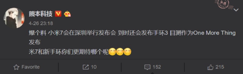 Xiaomi ค่ายผู้ผลิตสมาร์ทโฟนที่กำลังมาแรงจากประเทศจีน จะมีการเปิดตัวนาฬิกาข้อมืออัจฉริยะ Mi Band 3 ในช่วงปลายเดือนพฤษภาคมนี้ ล่าสุดก็ได้มีการเปิดเผยข้อมูลจาก @IceUniverse และ @Kumamoto Technology แหล่งข่าวลือจากประเทศจีน ที่ระบุว่าในวันเดียวกันกับการเปิดตัว Mi Band 3 จะมีการเปิดตัว Xiaomi Mi 7 สมาร์ทโฟนรุ่นใหม่ระดับเรือธงด้วย