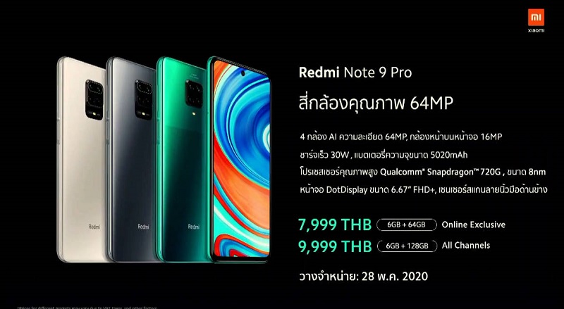 และ Redmi Note 9 Pro รุ่น RAM 6GB + 128GB สี Interstellar Grey, Glacier White และ Tropical Green วางจำหน่ายในราคา 9,999 บาท โดยได้รับของสมนาคุณพิเศษ Mi True Wireless Earbud Basic (ของมีจำนวนจำกัด) ณ Mi Authorized Store ทั่วประเทศและตัวแทนจำหน่ายอย่างเป็นทางการของเสียวหมี่ อาทิ TG FONE, COM 7 และ JAYMART*